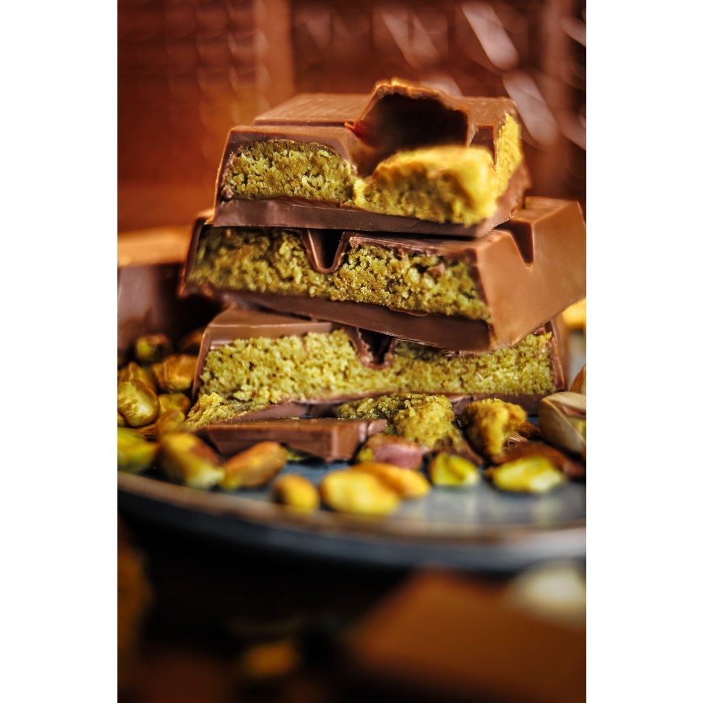 - Zloženie: mliečna čokoláda 34%: kakaové maslo, plnotučné sušené mlieko, kakaová hmota, emulgátor (sójový lecitín, bourbon vanilka) náplň: pšeničná múka, voda, pšeničný škrob, soľ, konzervant E202, rastlinný olej, maslo ghí, pistácie, sirup (voda, cukor), tahini